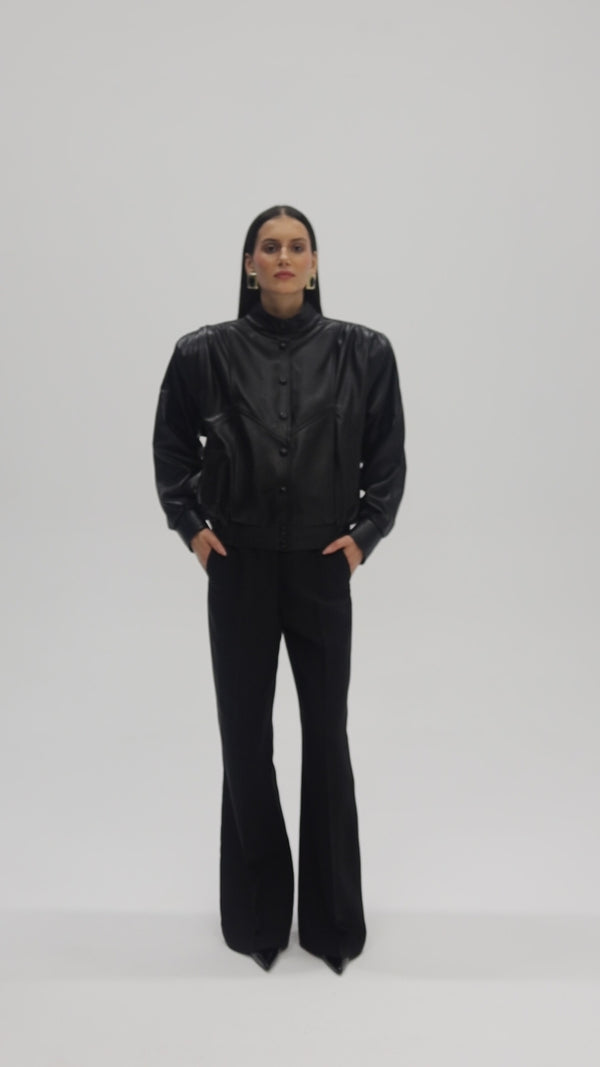 The Nostalgie jacket is crafted in Poland from ethically sourced genuine leather in a deep black. It was inspired by distinct geometric shapes.