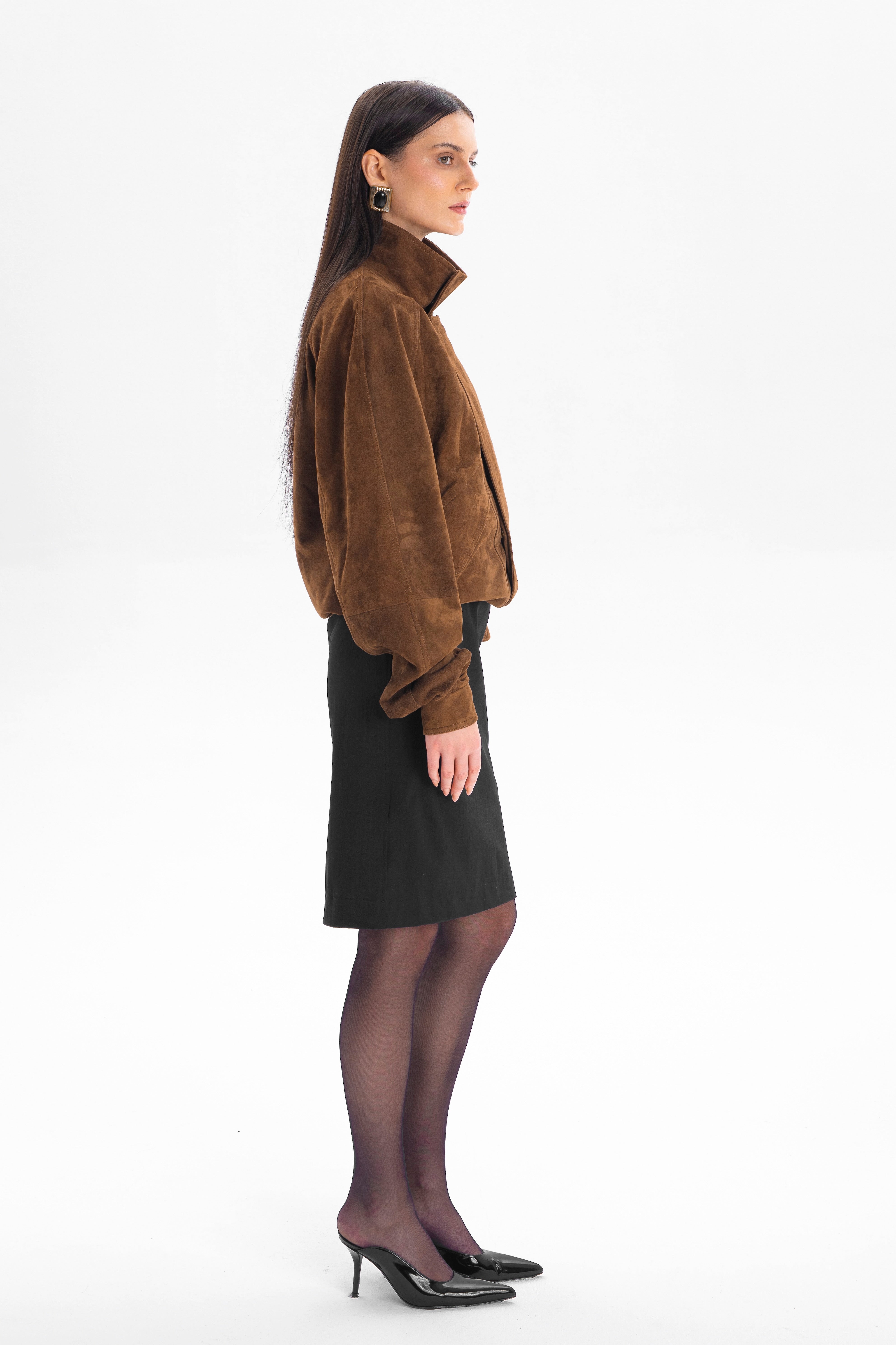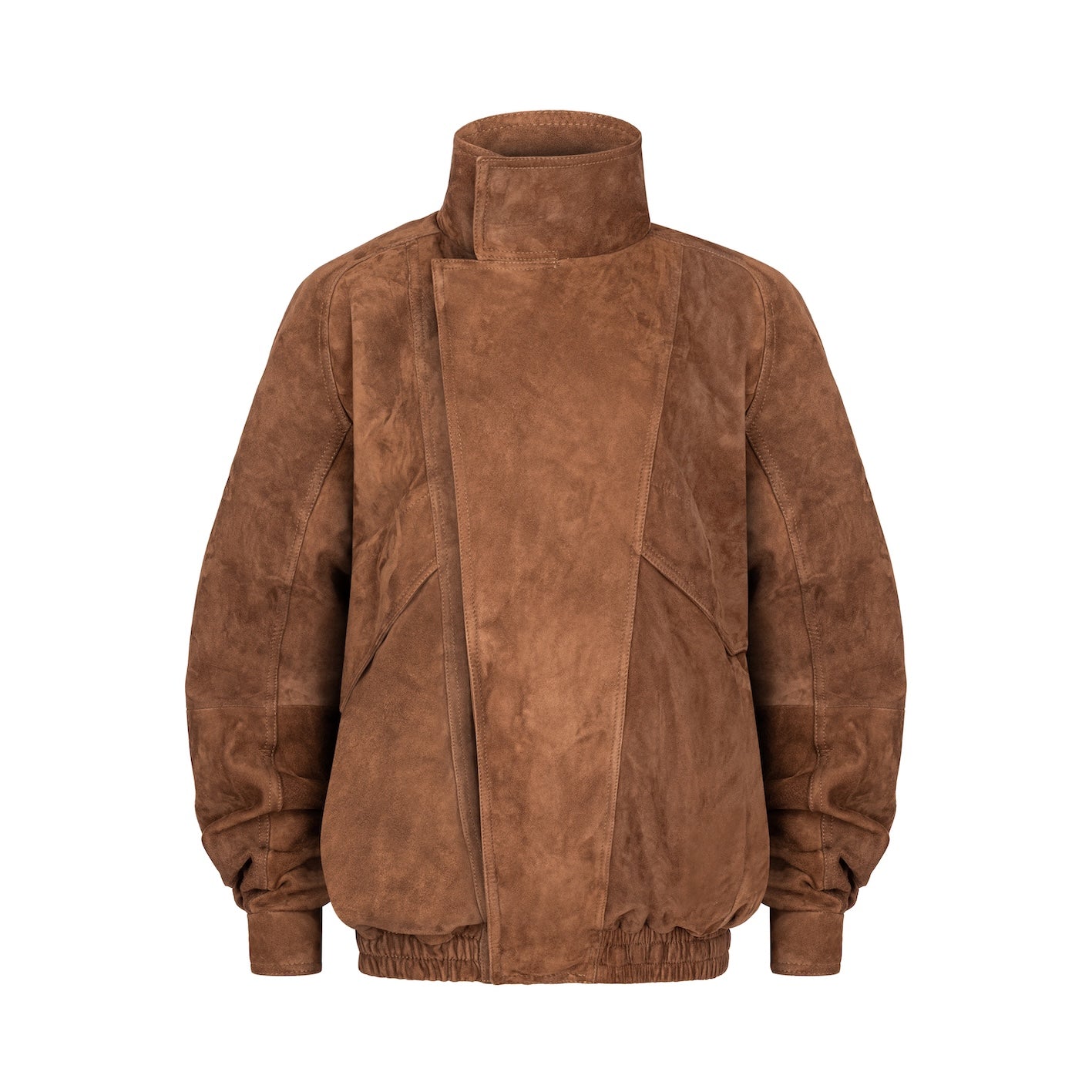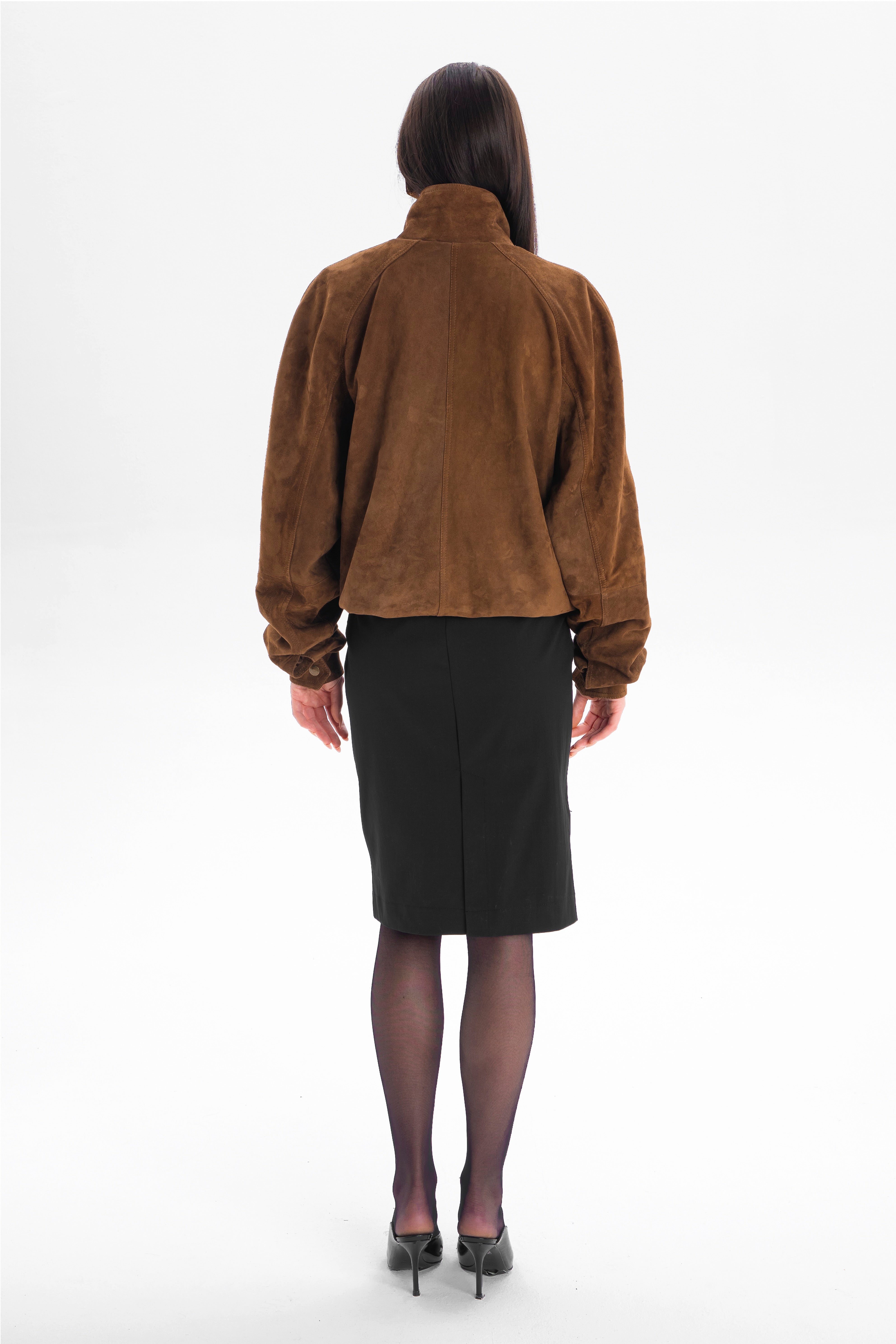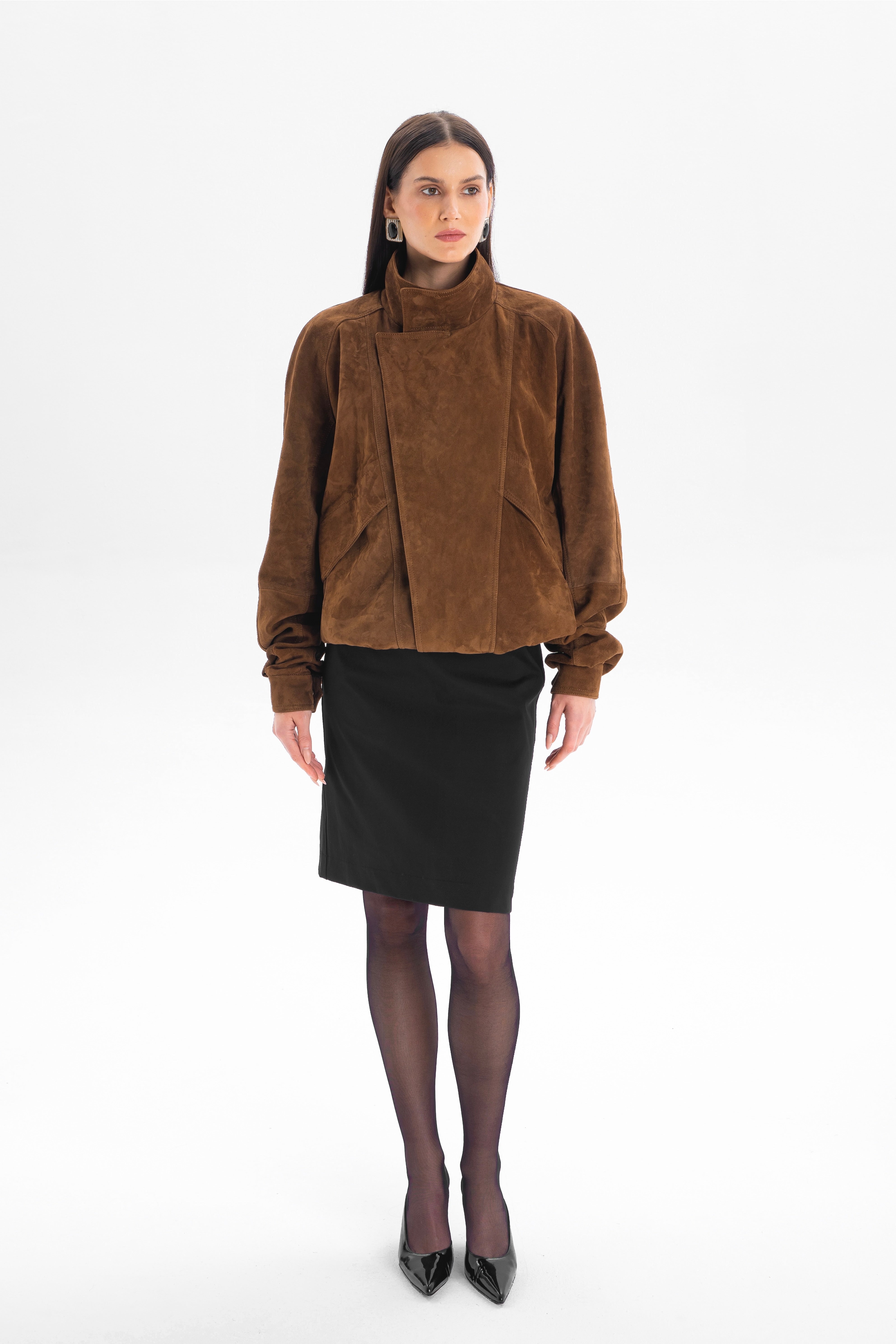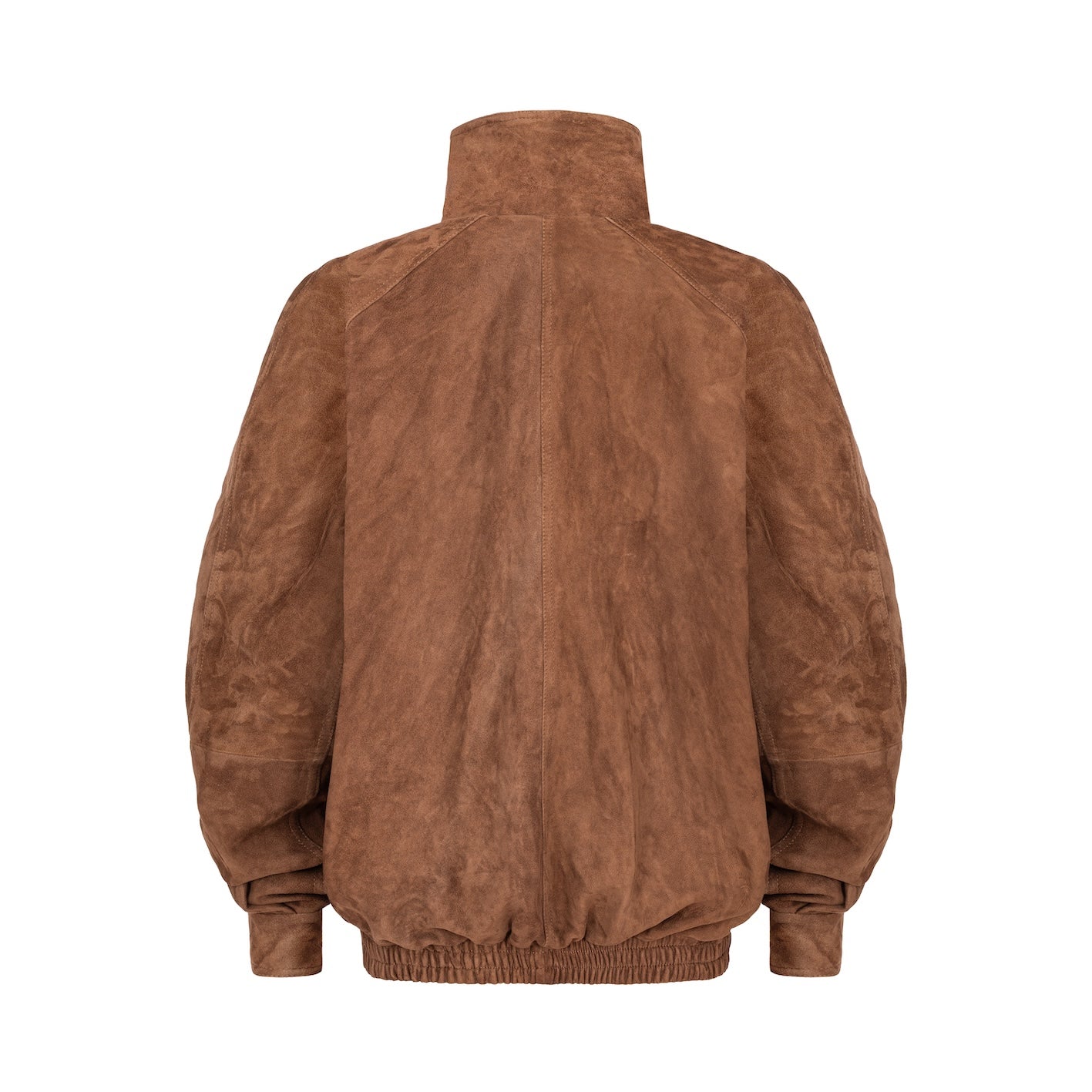 DÉVOUEMENT bomber jacket in suede is a modern interpretation of the classic bomber silhouette. Its oversized cut and high collar emphasize a sculptural form, while the soft suede leather adds a refined, luxurious character. Minimalist lines and elastic finishes ensure both comfort and elegance. This design merges premium materials with architectural simplicity.