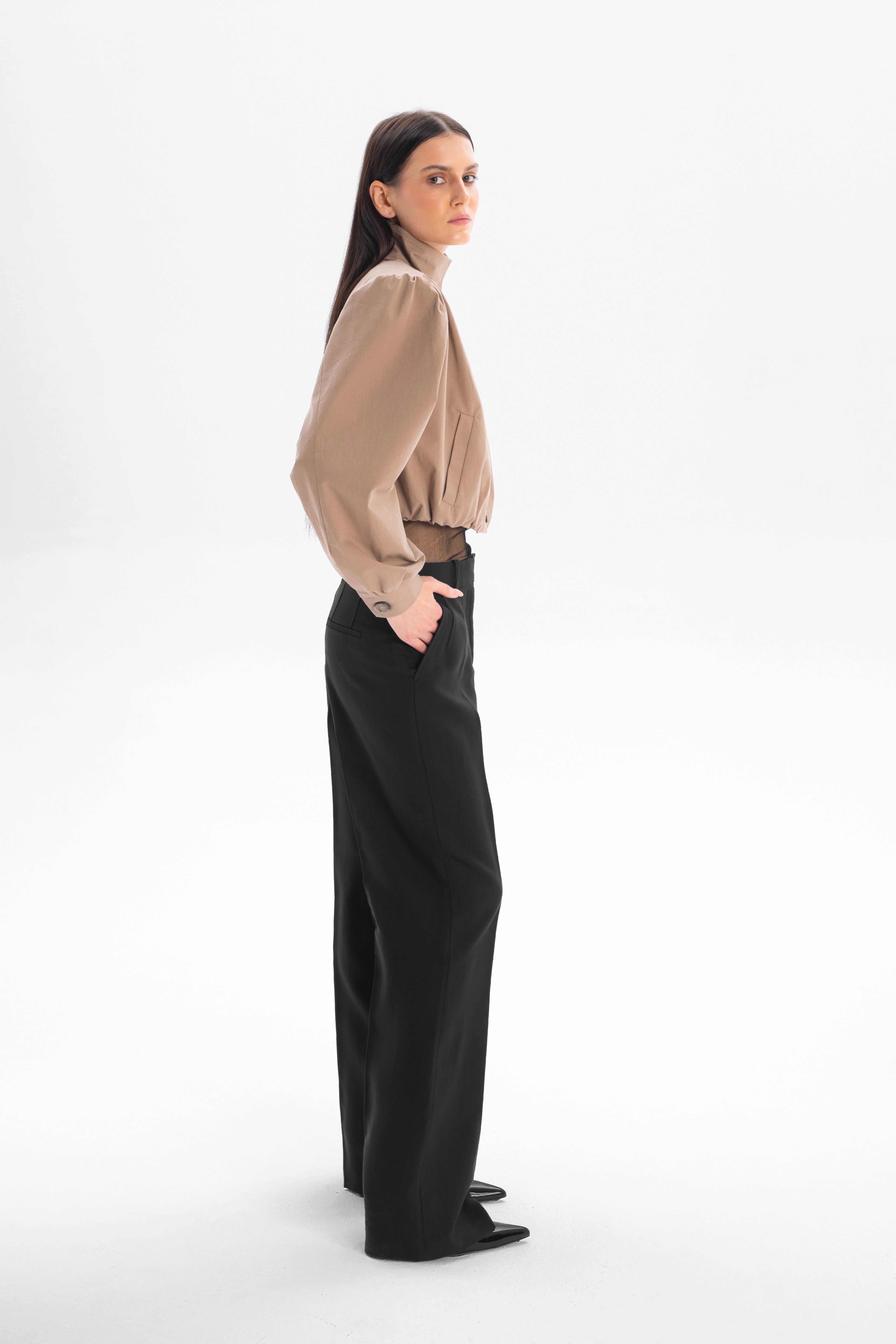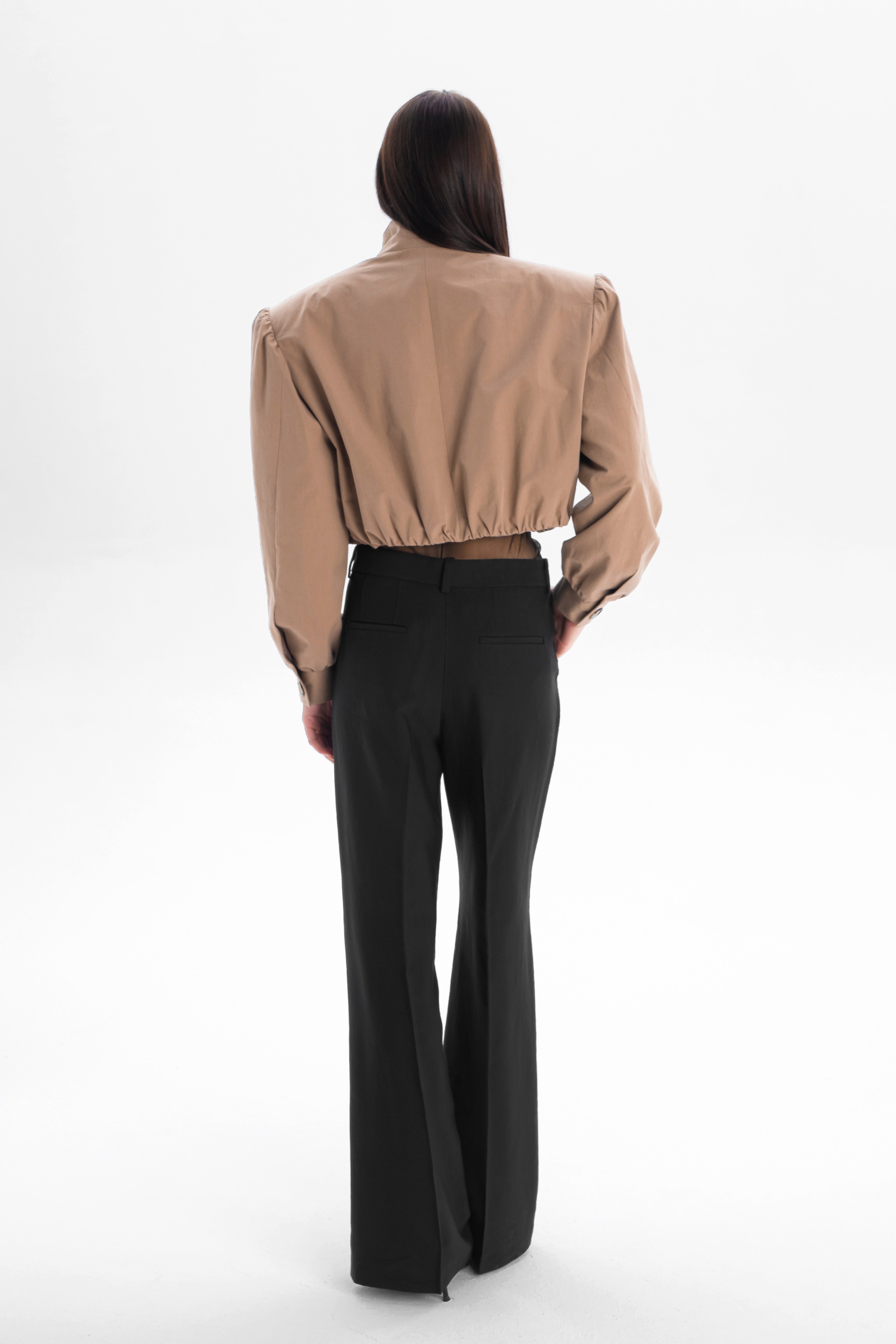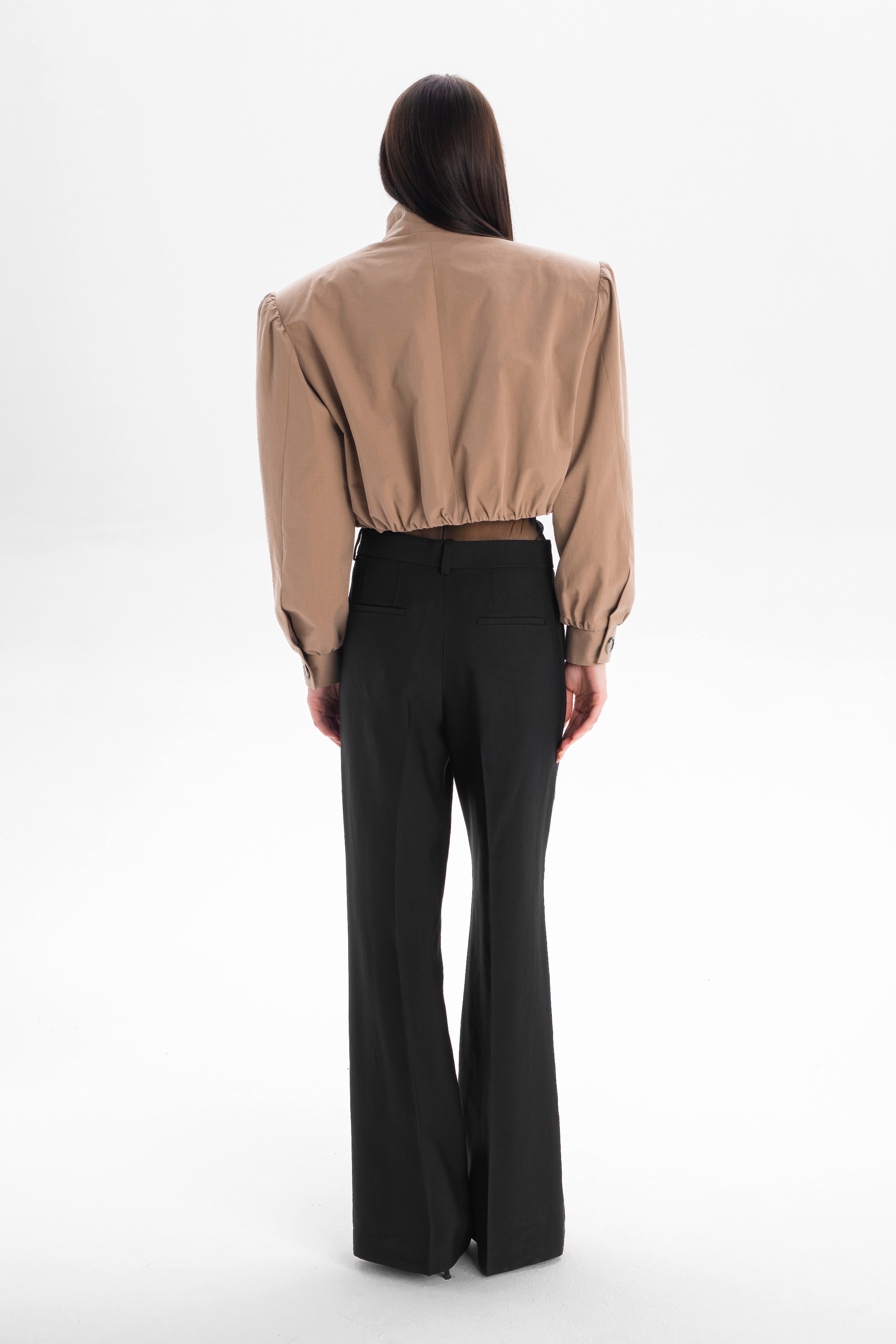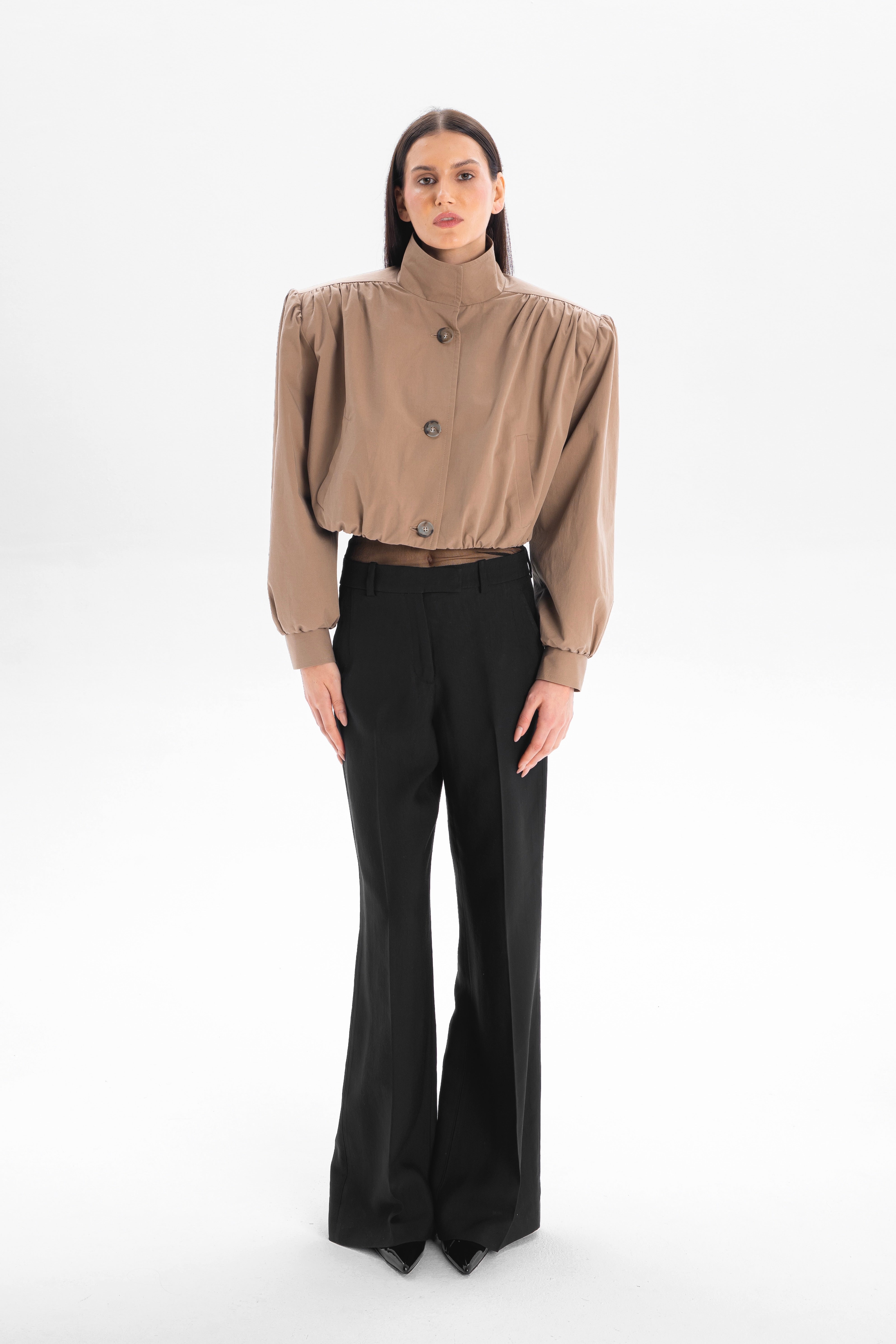 ENCHANTÉ trench cropped jacket in beige is a short design inspired by the classic trench coat, crafted from a lightweight fabric in an elegant beige shade. The simple, minimalist cut is enhanced by gentle gathering at the shoulders and subtly puffed sleeves finished with cuffs, adding a touch of feminine softness. A classic collar and large buttons emphasize the timeless character of the design. The cropped silhouette beautifully highlights the waistline, creating a balanced, modern look. Perfect for both everyday city outfits with high-waisted pieces and more refined smart-casual ensembles.