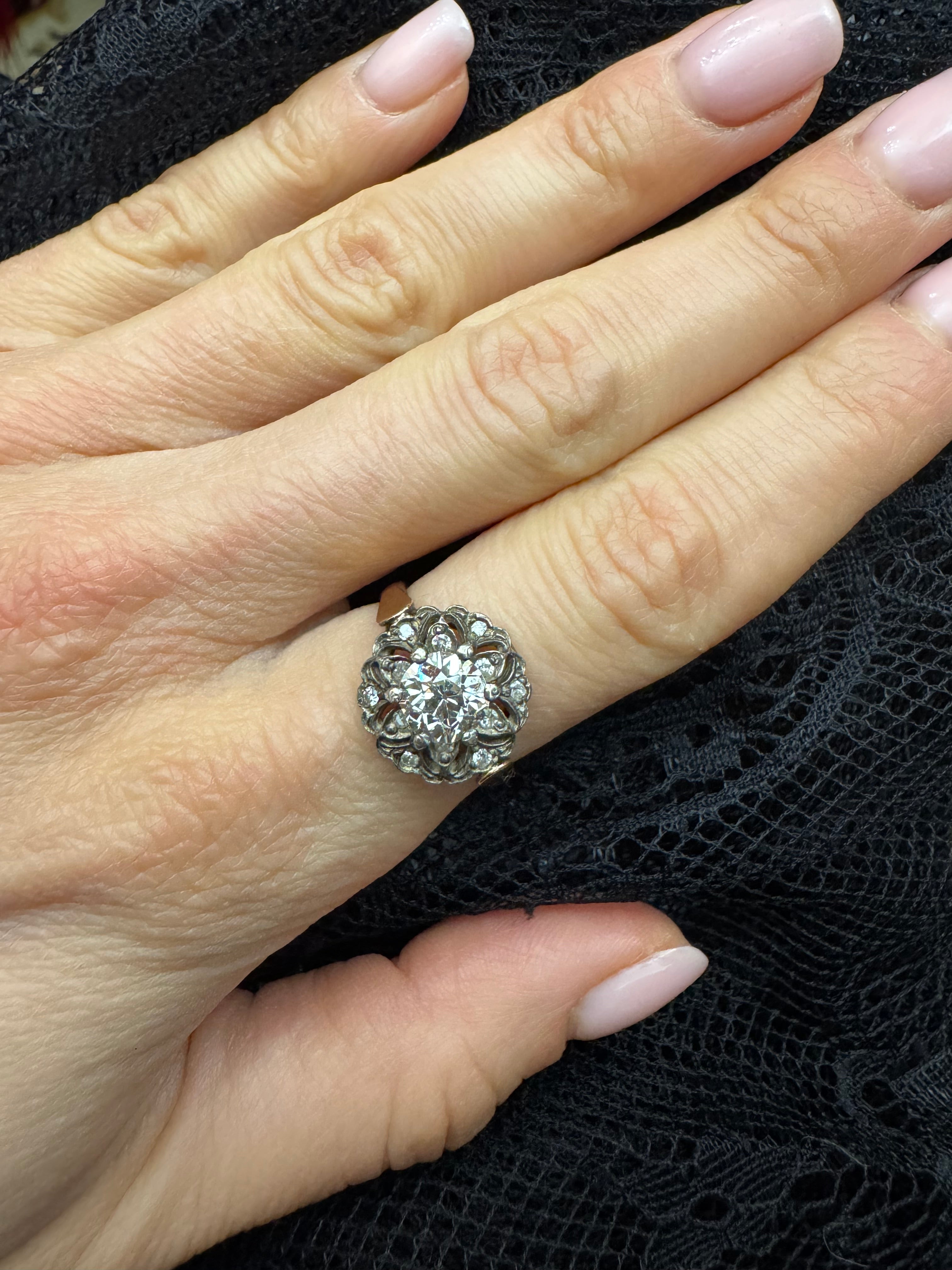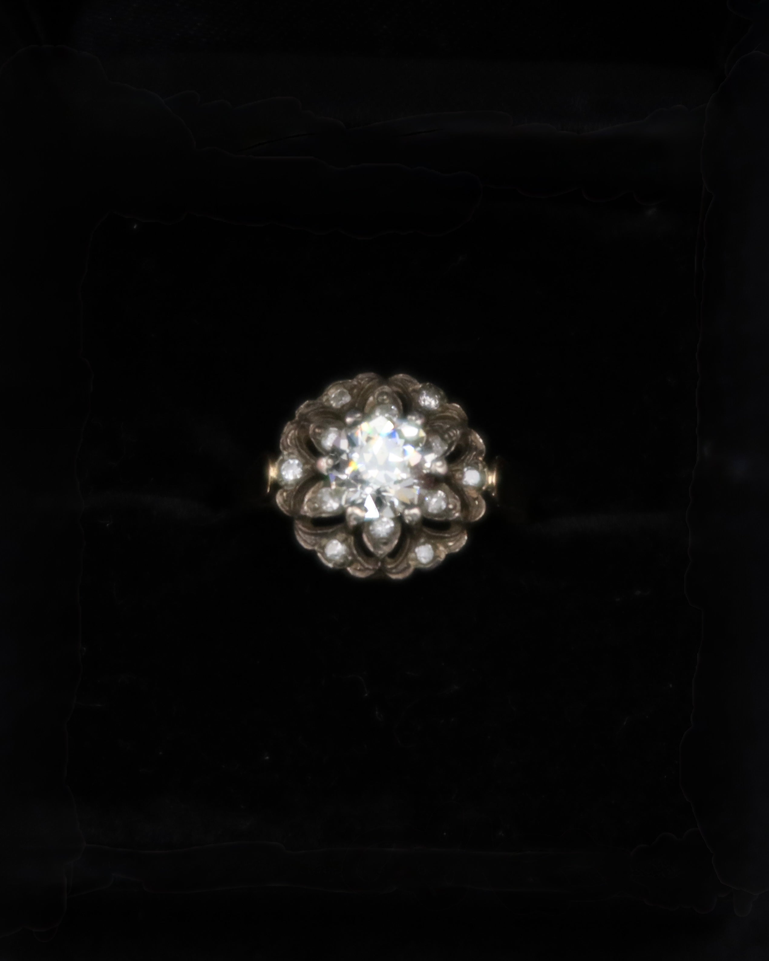 Szlachetna forma kwiatu, w której światło odgrywa główną rolę. Centralny diament o hipnotyzującym blasku otoczony jest misterną kompozycją mniejszych kamieni, tworzących pełną, trójwymiarową rozetę. Każdy detal oprawy został zaprojektowany tak, aby wydobywać maksymalną grę światła i nadać całości wrażenie głębi oraz miękkiej, świetlistej aury.