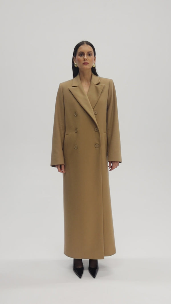 JALOUSIE straight coat in carmel vol A long, double-breasted coat with a simple cut that combines classic elegance with modern minimalism. Its refined caramel hue adds warmth and refinement, making it an ideal choice for the fall and winter seasons. Wide lapels and carefully selected buttons emphasize its timeless form, while the refined lines lend a slim and light silhouette.