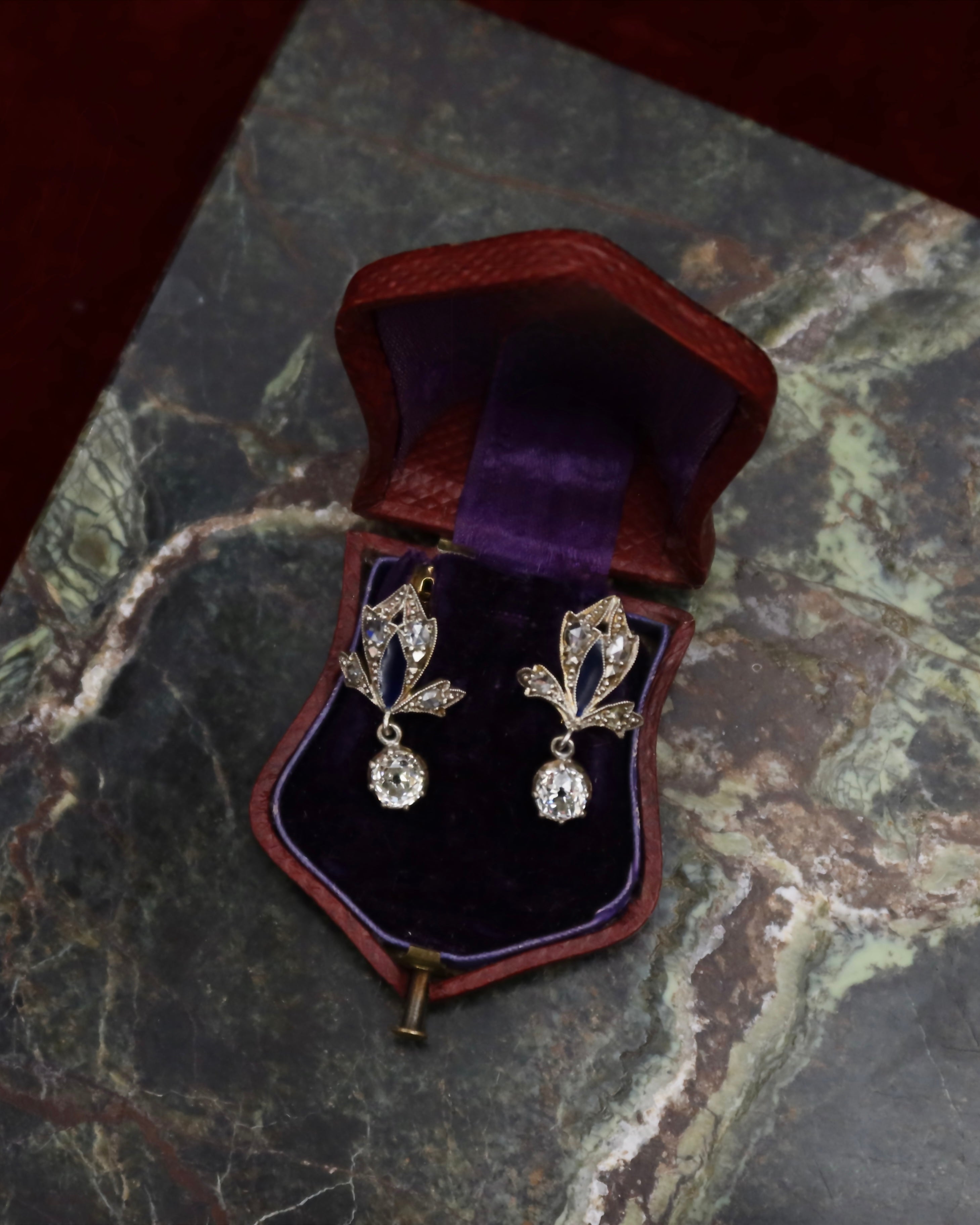 Wyjątkowa para antykwarycznych kolczyków z naturalnymi diamentami, zachwycająca subtelną formą i kunsztem jubilerskiego wykonania. Ten niezwykle rzadki model wyróżnia się finezyjnym, roślinnym motywem, charakterystycznym dla stylistyki przełomu XIX i XX wieku.