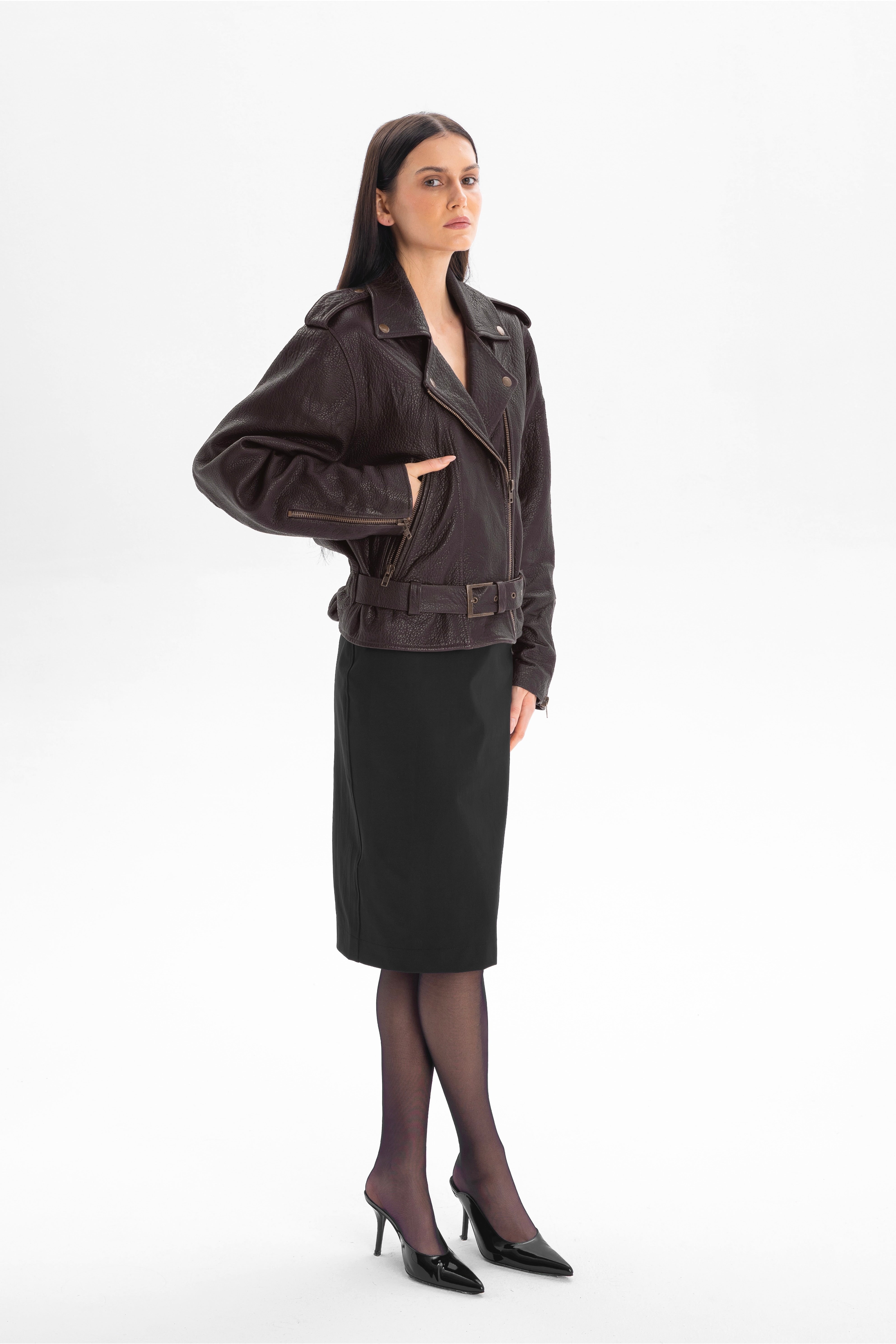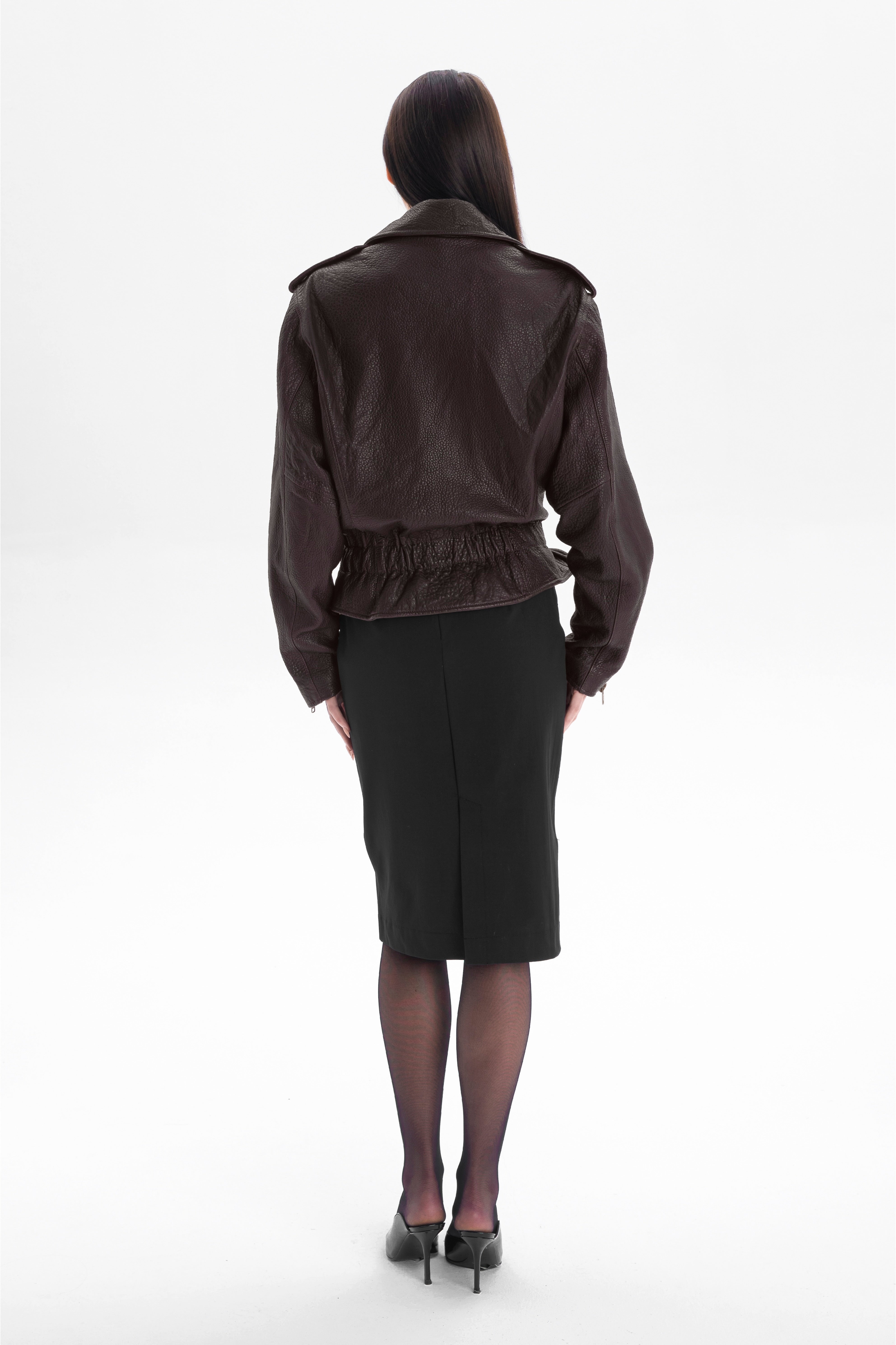 LIBERTÉ retro waisted biker jacket in chocolate texture a reinterpretation of the classic biker jacket in a luxurious edition. Its fitted waist emphasizes the silhouette with strength and elegance, while the sharp shoulder line and signature biker details – the asymmetric zipper, shoulder epaulettes, waist belt, and metal accents – bring a bold, rock-inspired touch.