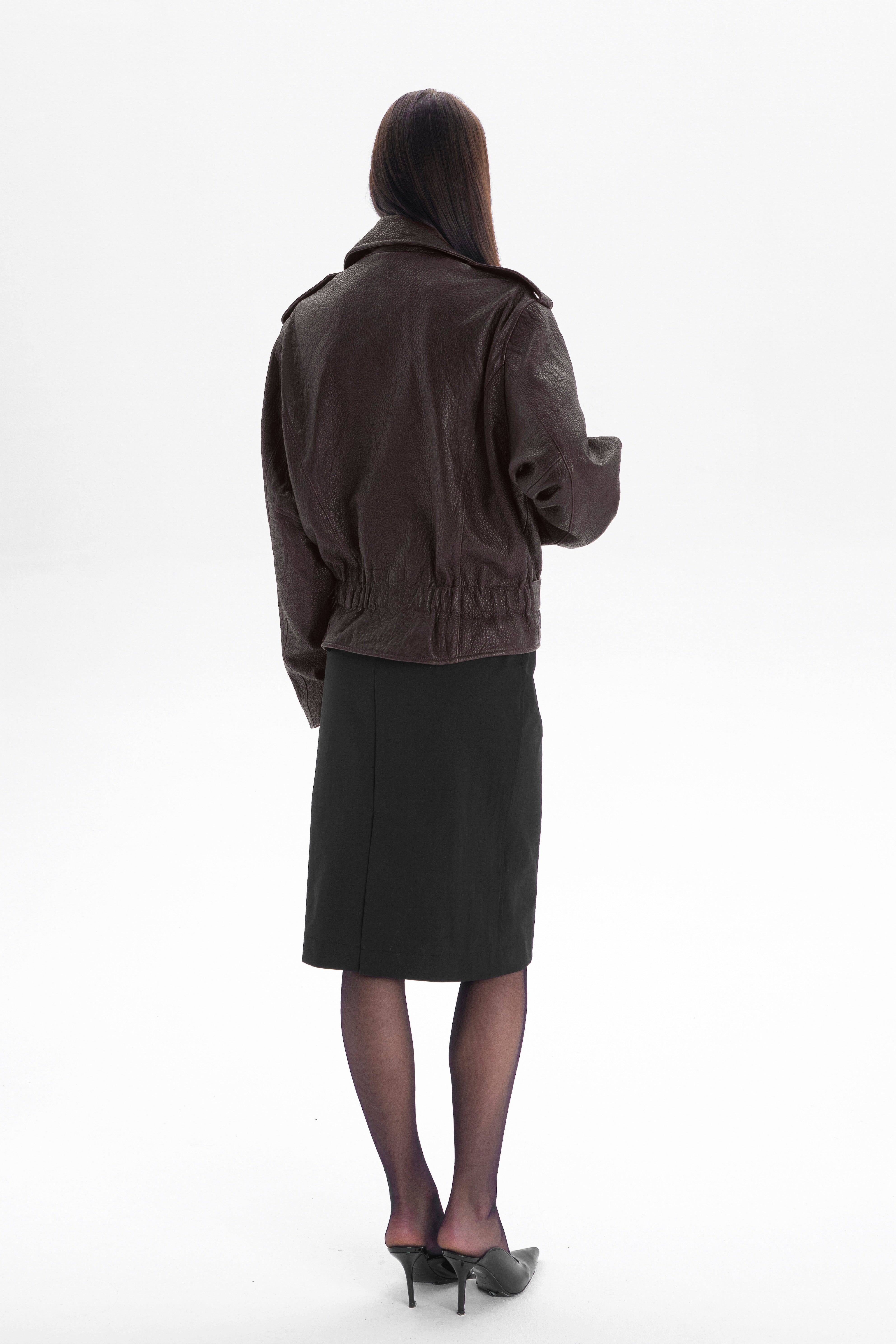 Crafted from exclusive leather, specially dyed and embossed for our brand, it features a unique texture and a deep chocolate shade. Thanks to this process, every LIBERTÉ jacket is truly one of a kind, distinguished by its refined surface and timeless character.