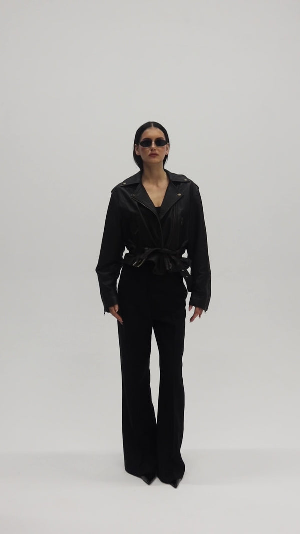 The LIBERTÉ retro waisted biker jacket in chocolate texture is a luxurious reinterpretation of the classic biker jacket. Its fitted cut accentuates the silhouette, lending it a distinct and elegant look, while the strong shoulder line and distinctive biker details—the offset zipper, shoulder straps, waist belt, and metal hardware—add a bold, rock-inspired touch.