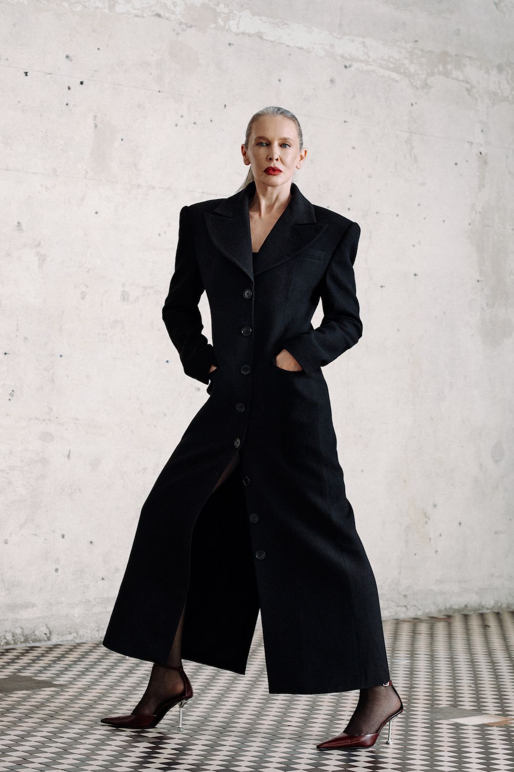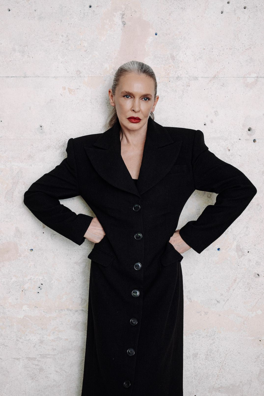 COLÉRE waisted coat in black to elegancki, długi płaszcz o wyraźnie zaznaczonej talii, który łączy w sobie ponadczasową klasykę i nowoczesną siłę formy. Smukła linia sylwetki została podkreślona precyzyjnym krojem, długim rzędem guzików oraz ostrą konstrukcją ramion, które dodają całości wyrazistości.
