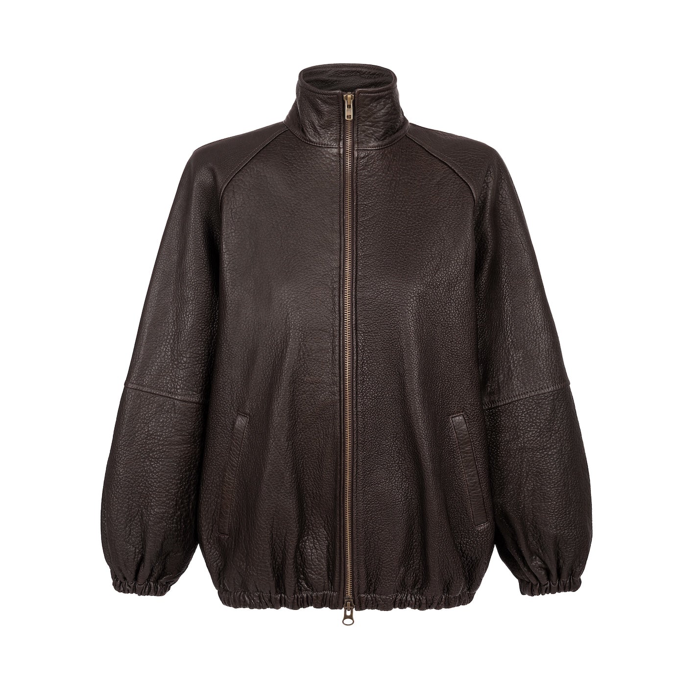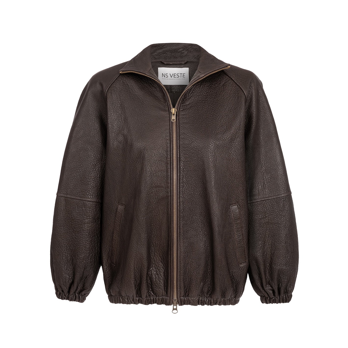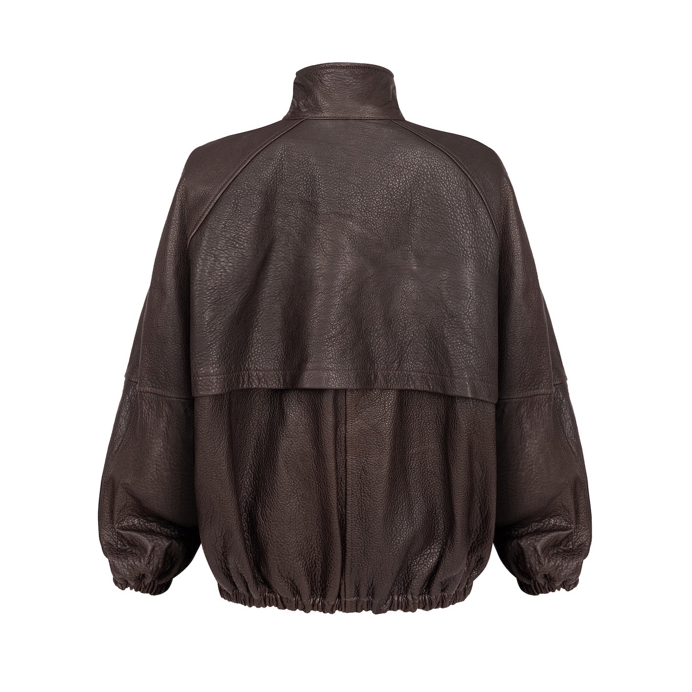 CALME chocolate texture is a leather bomber jacket with a minimalist design and an oversized silhouette. Made from soft leather, it combines modern style with everyday comfort. Elastic finishes give it a relaxed, effortless feel.