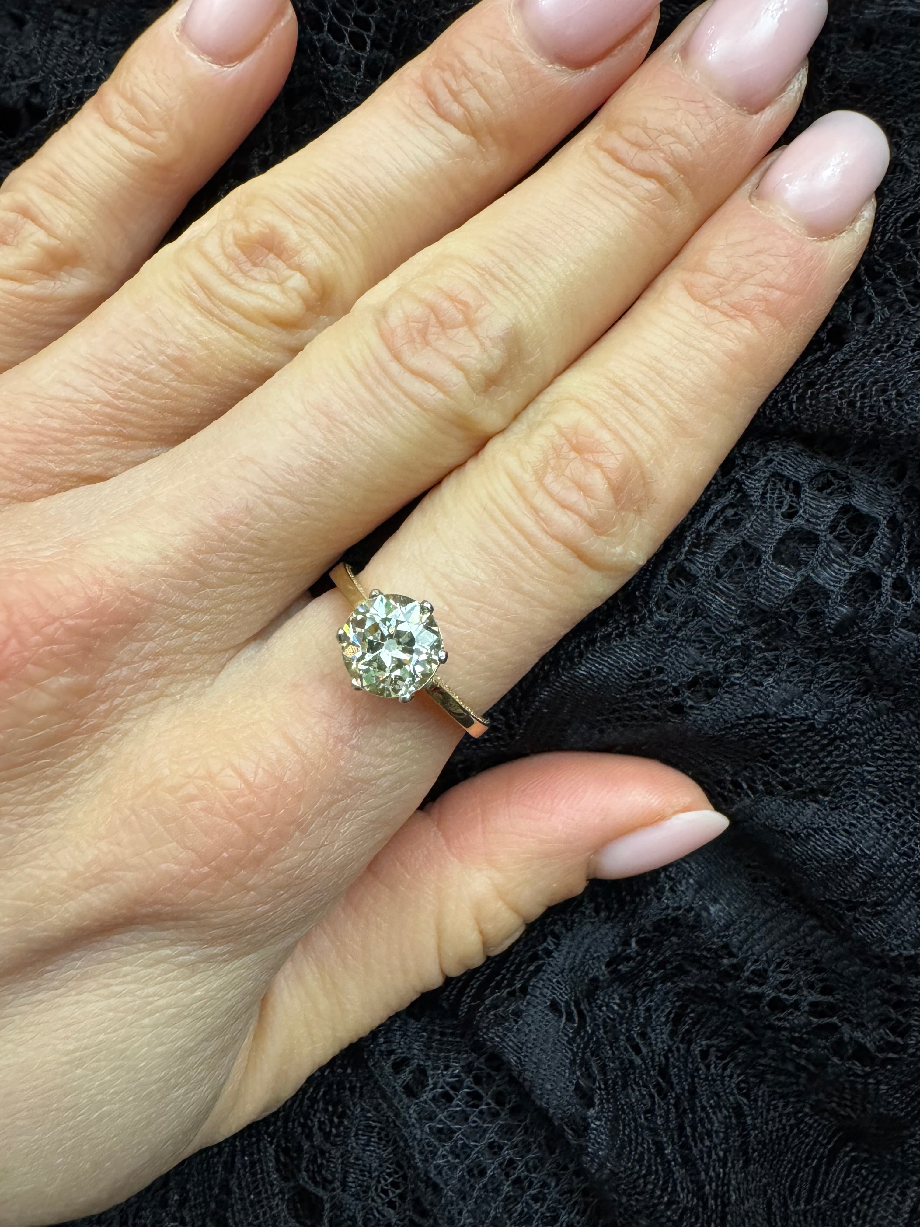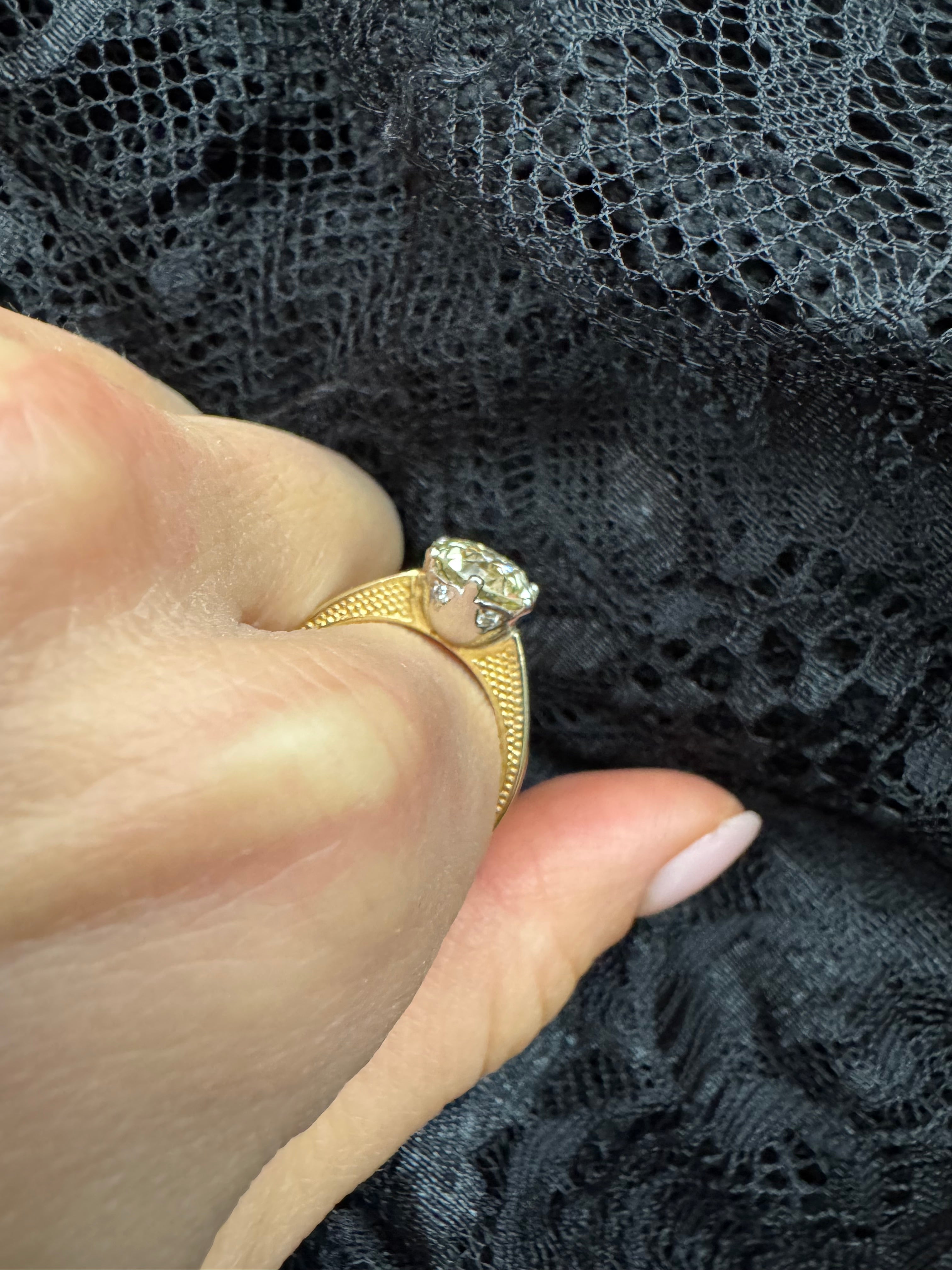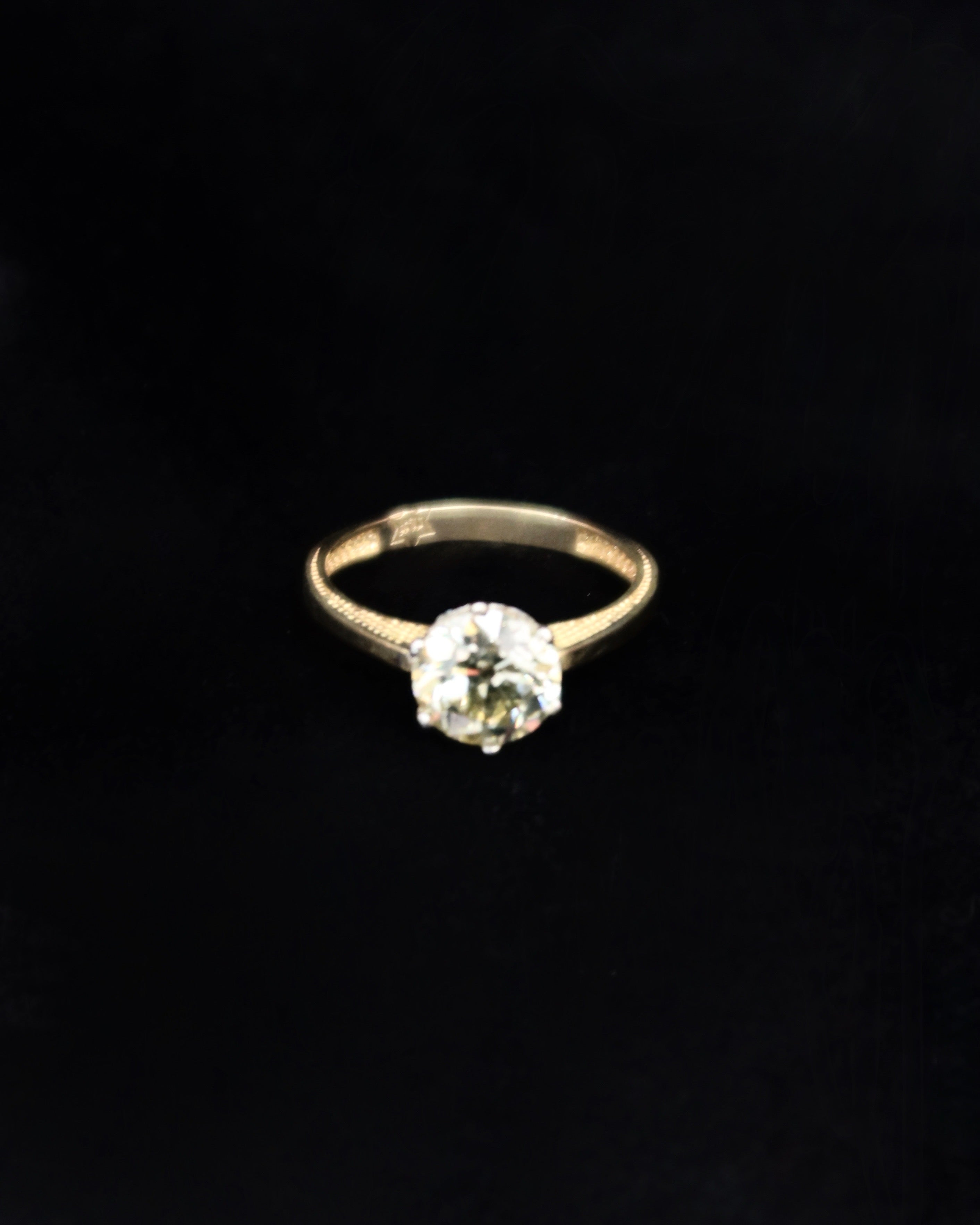 Centralny diament o szlifie brylantowym został osadzony w subtelnej, podniesionej koronie, która pozwala światłu swobodnie przenikać przez kamień i wydobywać jego pełną głębię. Delikatnie zdobiona, złota szyna dodaje całości charakteru i dyskretnego wyrafinowania.