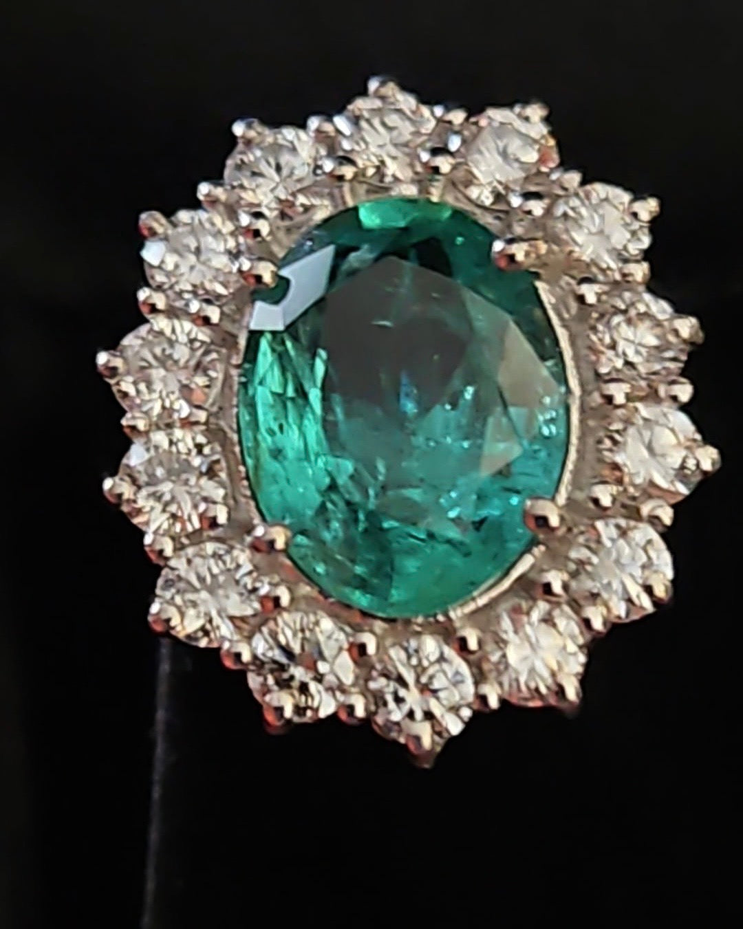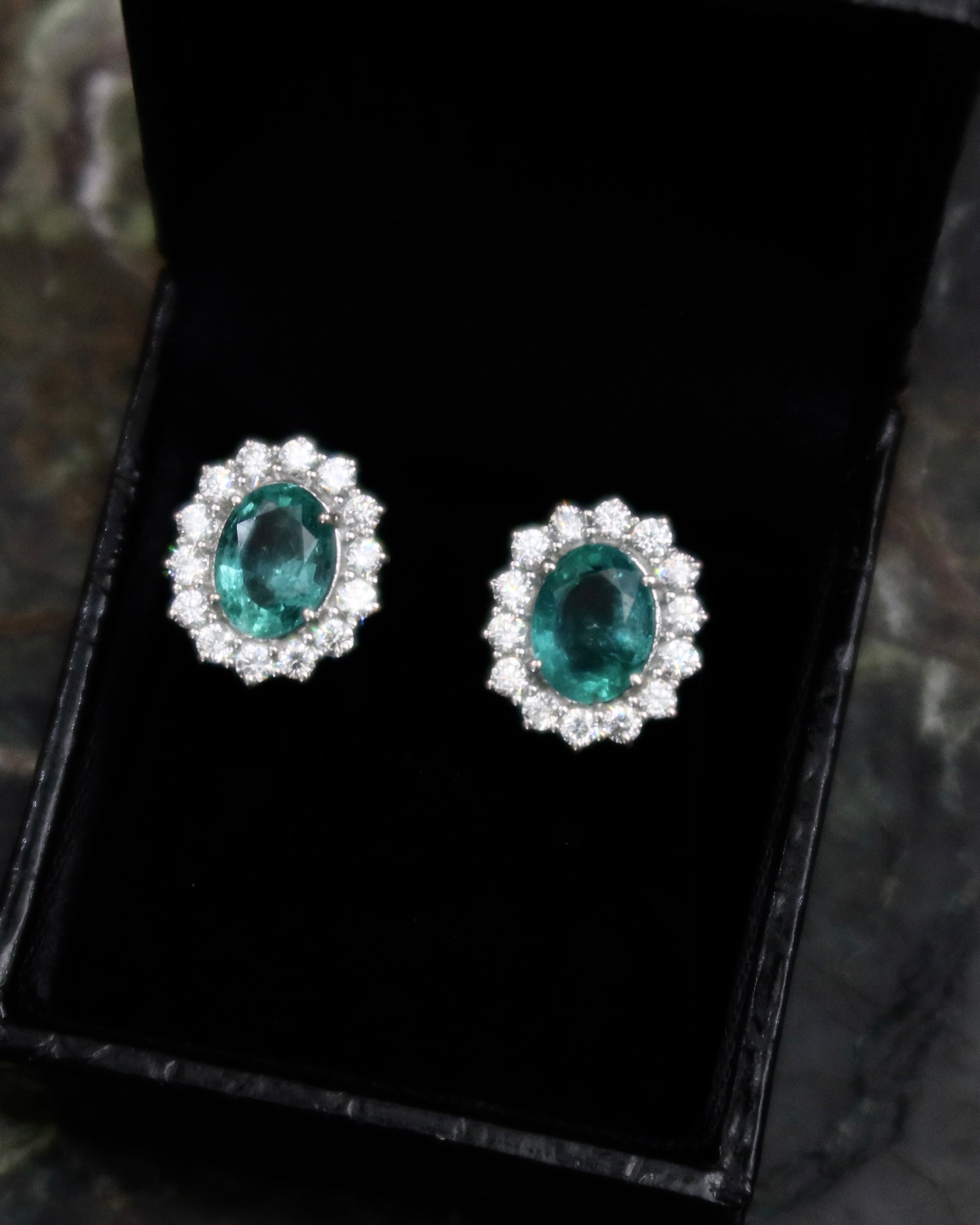 Wyjątkowe kolczyki wykonane ze srebra próby 750, o łącznej wadze 5,8 g. Centralnym punktem każdego kolczyka jest owalny zielony kamień o głębokiej, nasyconej barwie, prawdopodobnie szmaragd, otoczony efektowną koroną drobnych diamentów w szlifie brylantowym. Kompozycja tworzy klasyczny układ typu halo, podkreślający blask i intensywność kamienia centralnego.
