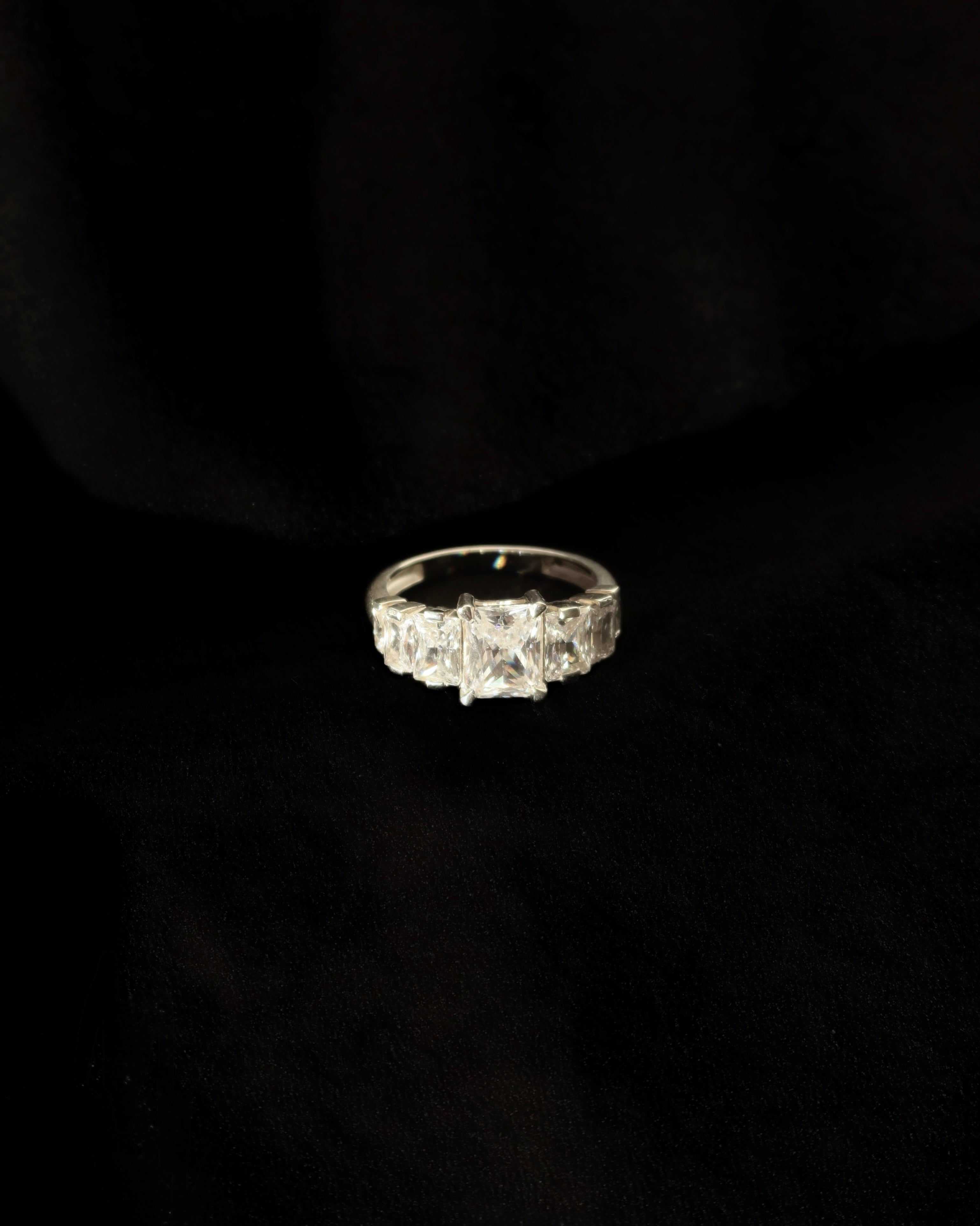 Jego otwarta i asymetryczna forma wspaniale gra ze światłem i przyciąga wzrok. Wykonany ze srebra próby 925, pierścionek jest zwieńczony dwoma prostokątnymi cyrkoniami Swarovskiego, które iskrzą przy każdym ruchu.